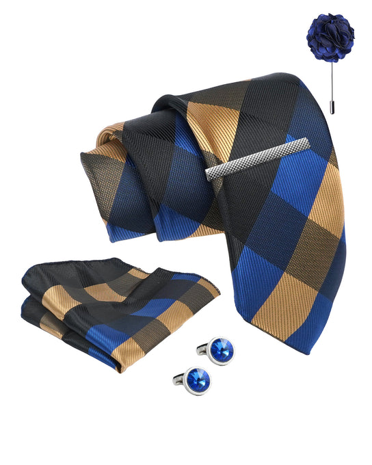 AXLON Formal/Casual Printed Polyester Necktie Set with Pocket Square, Brooch Pin and Cufflinks for Men (Free Size, Blue )