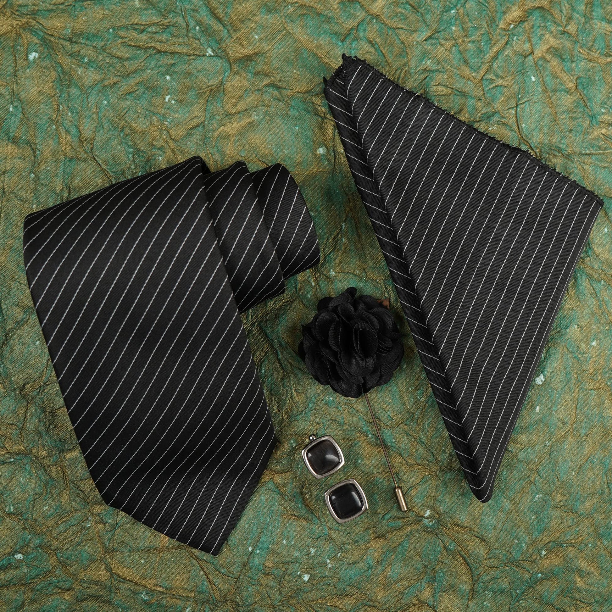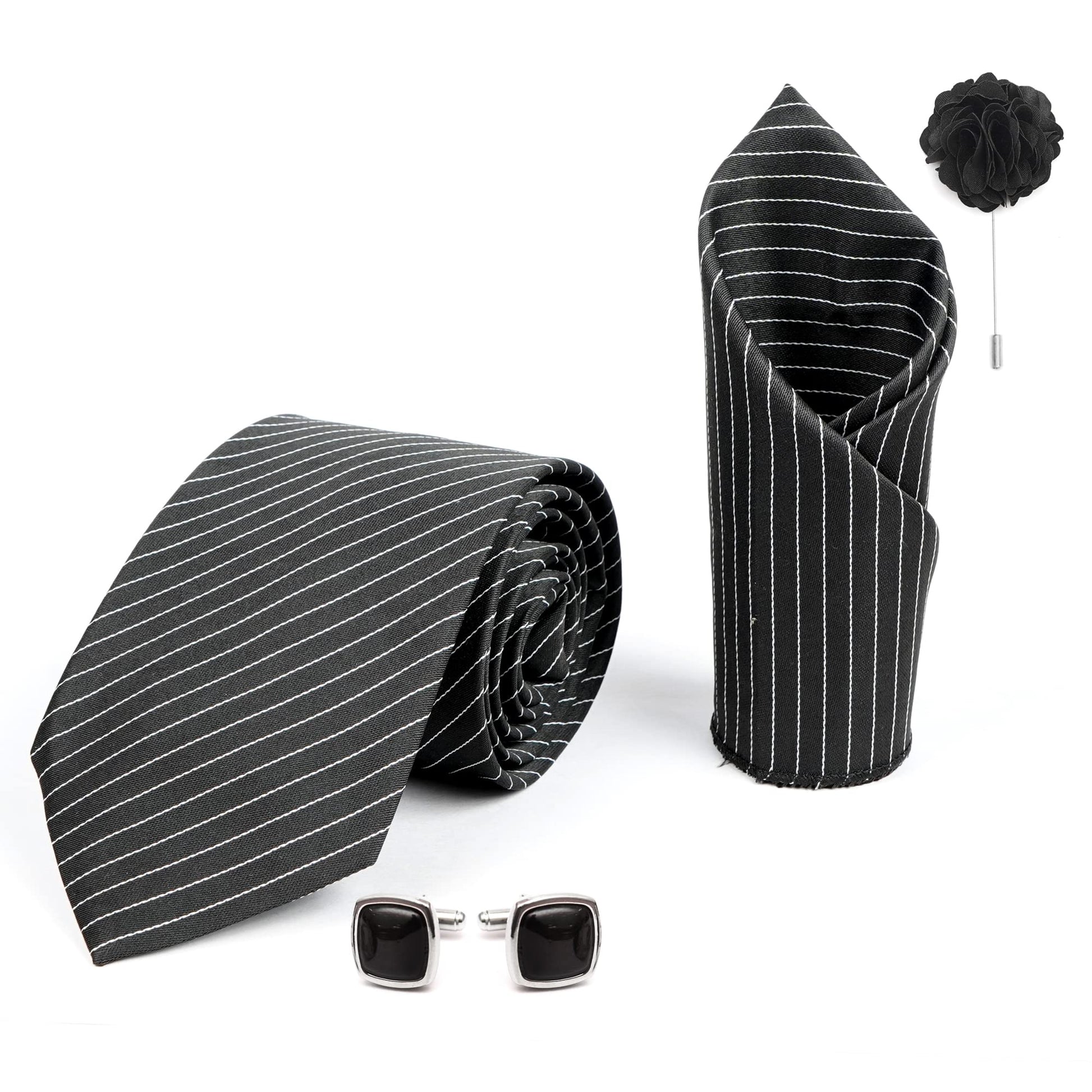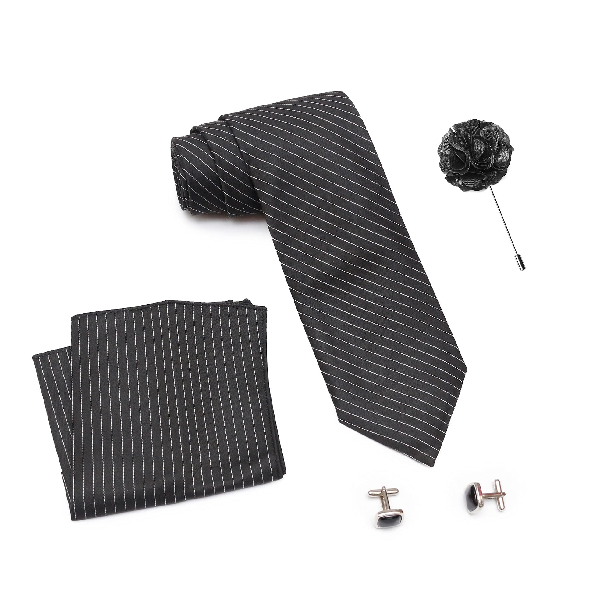 AXLON Mens Plaid Stripped Silk Necktie Gift Set With Pocket Square Cufflinks & Brooch Pin Tie For Men Formal With Leatherite Box (S1RX Free Size) | (Leather Gift Box) (Pack of 4)