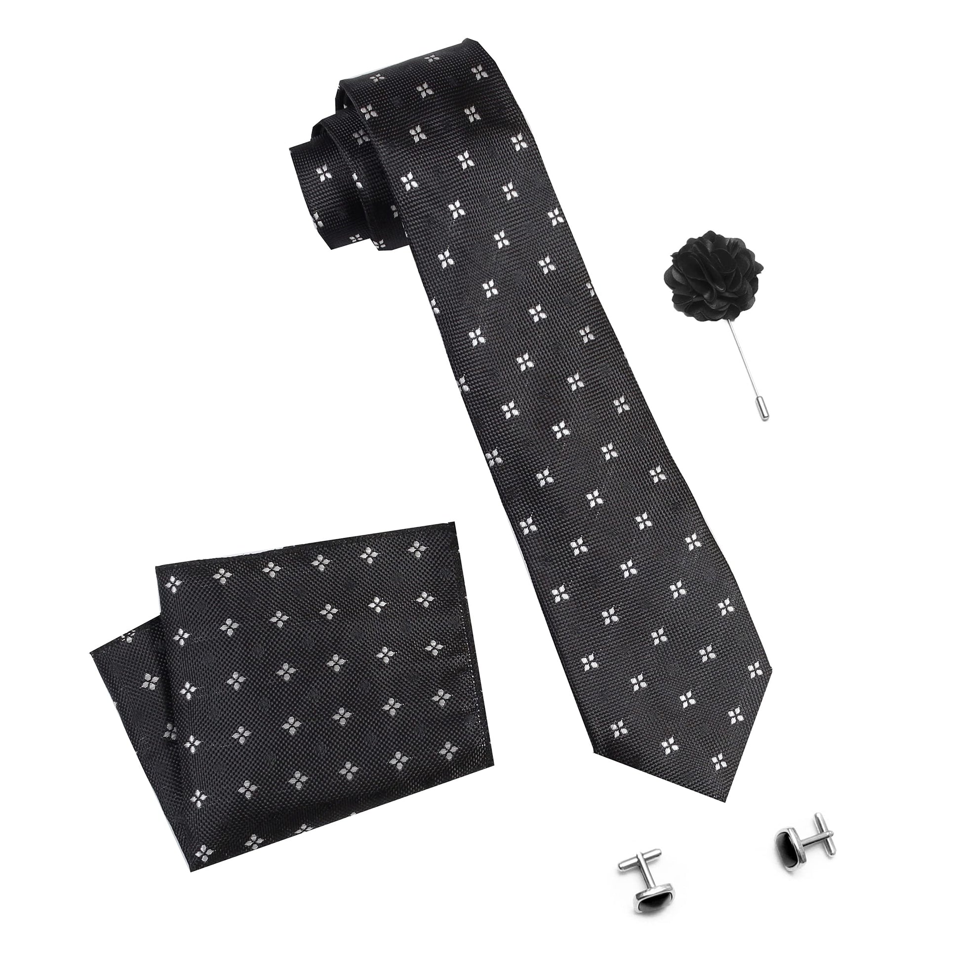 RIZORO Mens Plaid Dotted Silk Necktie Gift Set With Pocket Square Cufflinks & Brooch Pin Formal Tie With Leatherite Box (4D2RX Free Size) | (Leather Gift Box) (Pack of 4)