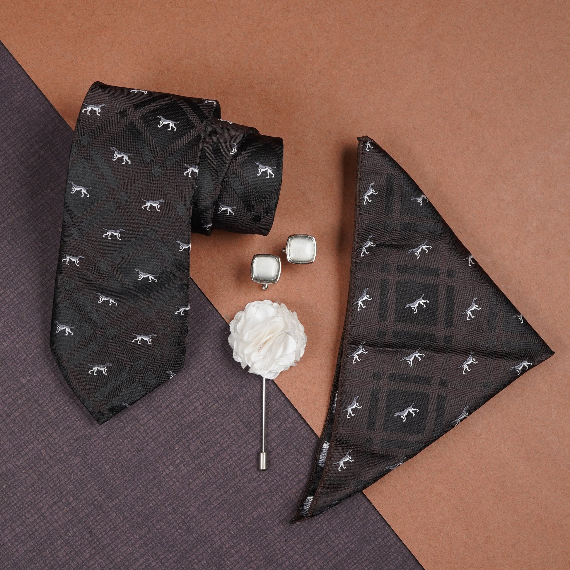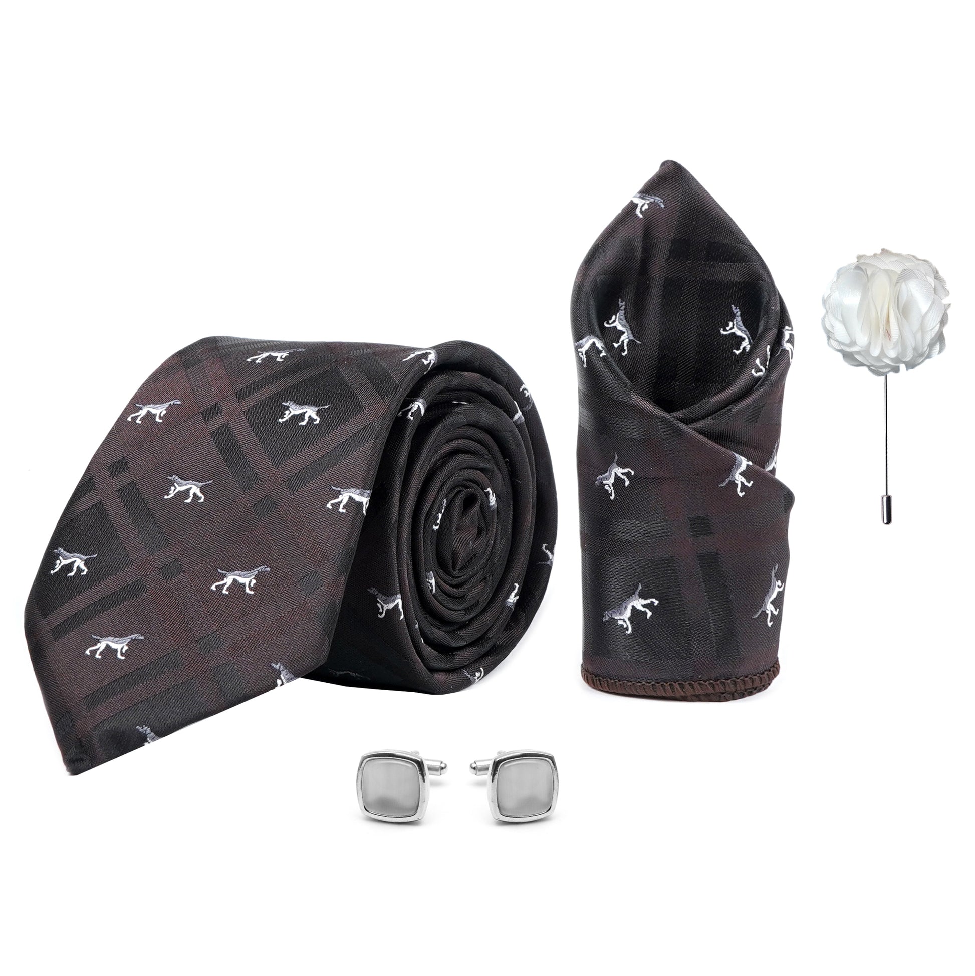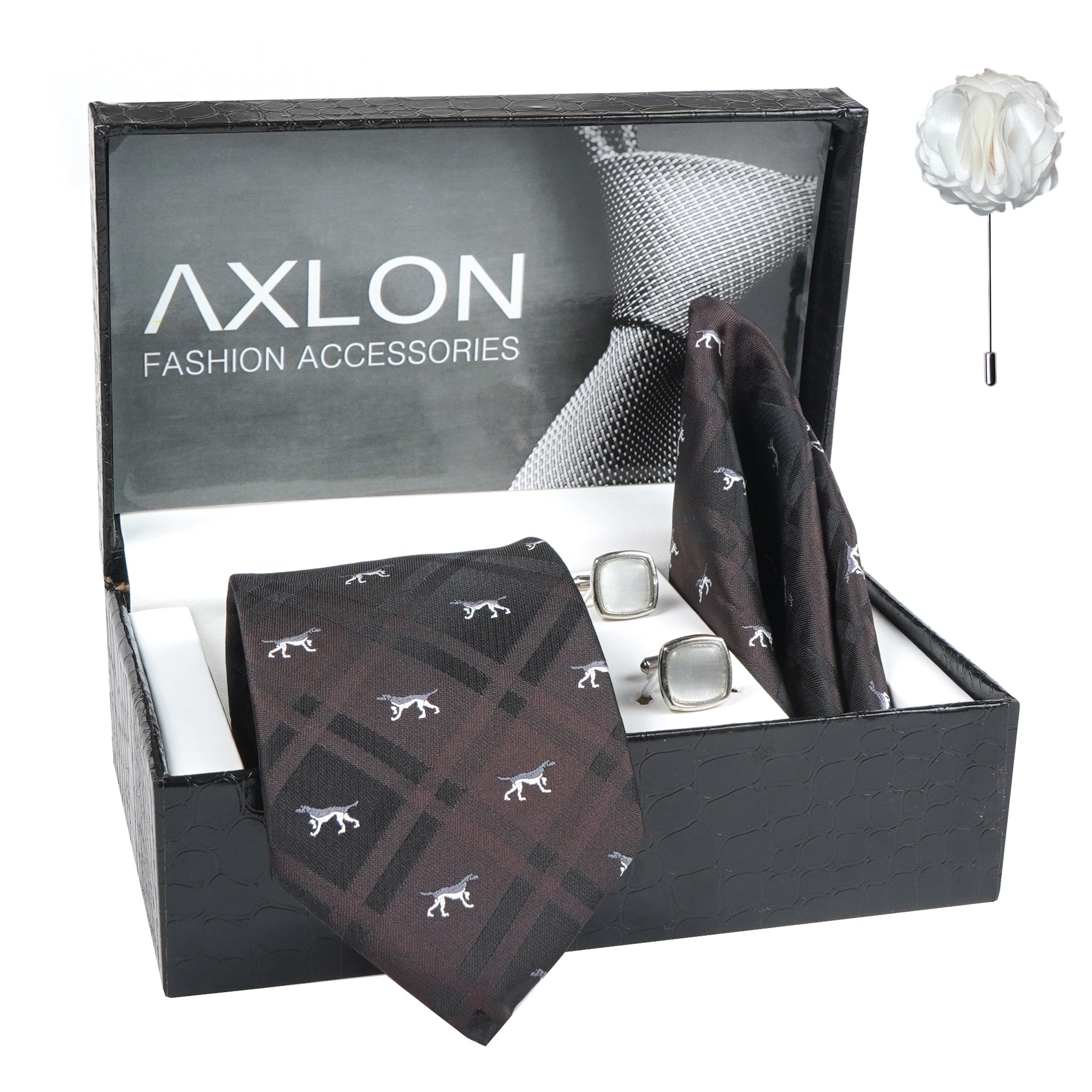 Axlon Men's Check Micro Wooven Silk Necktie Gift Set With Pocket Square Cufflinks & Brooch Pin Tie for Men Formal Tie Set with Box
