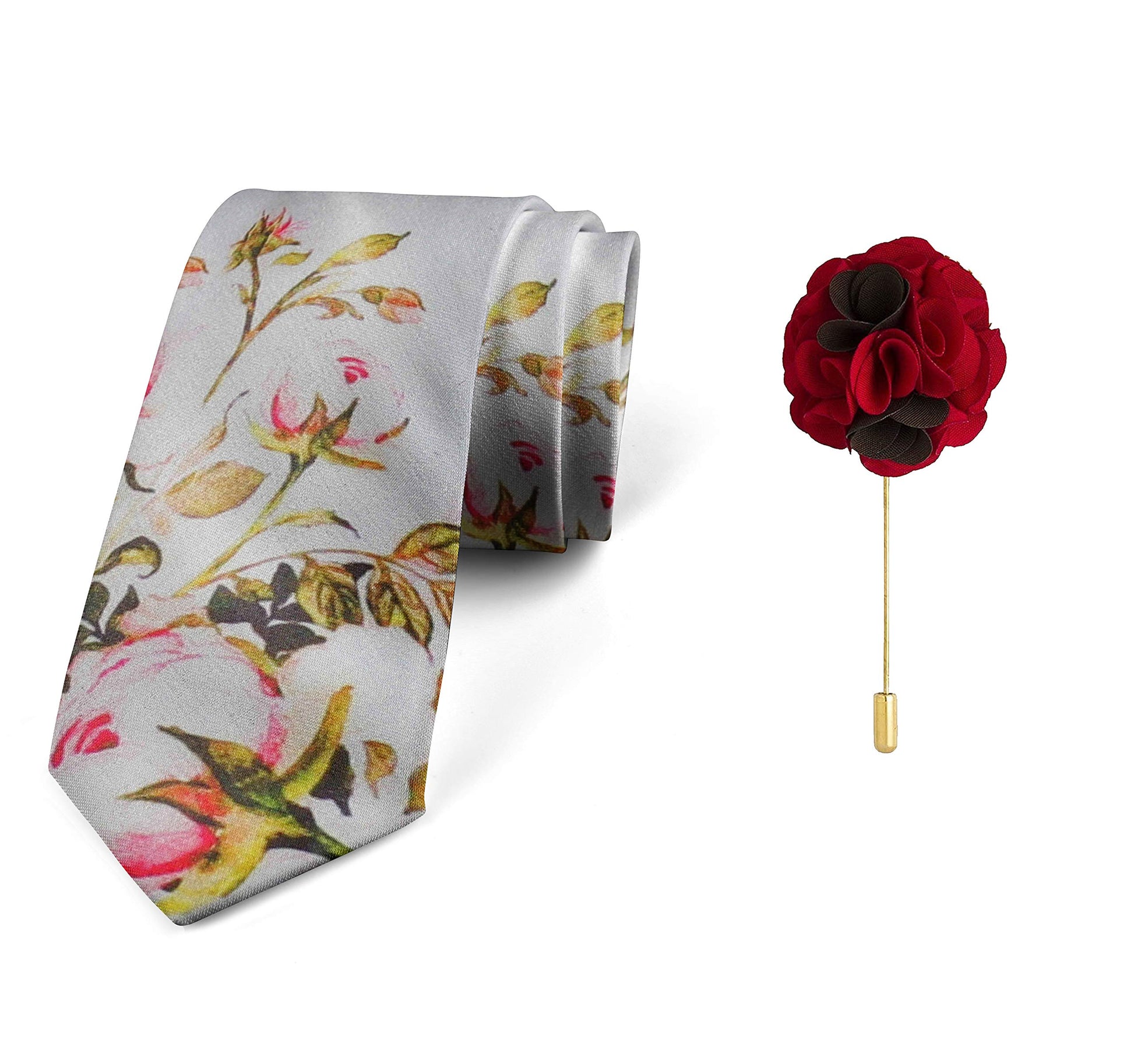 Axlon Men's Micro Polyester Floral Necktie Set with Pocket Square and Brooch Pin (Beige ,Free Size)