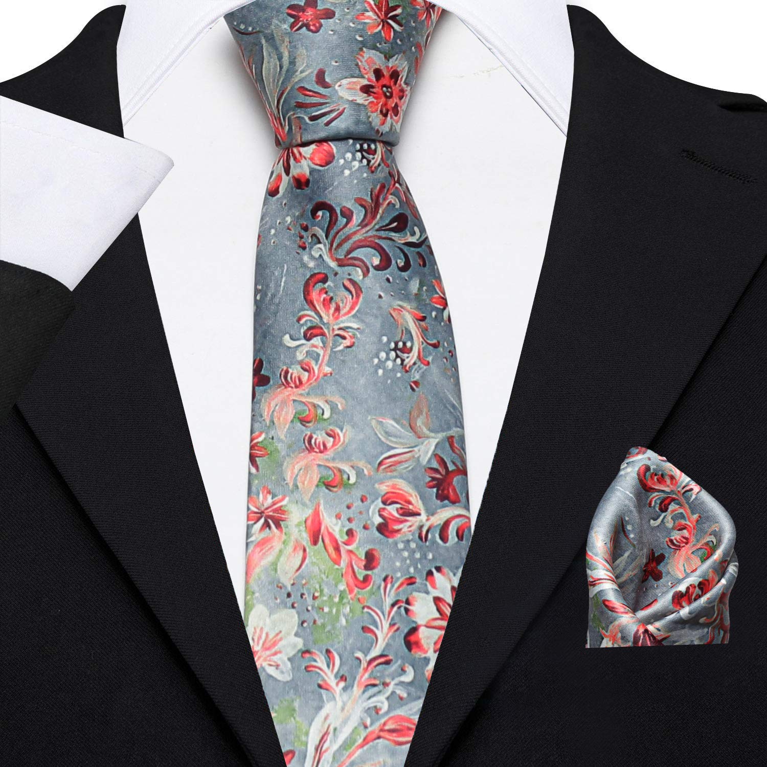 Axlon Men's Micro Polyester Floral Necktie Set with Pocket Square and Brooch Pin (Grey ,Free Size)