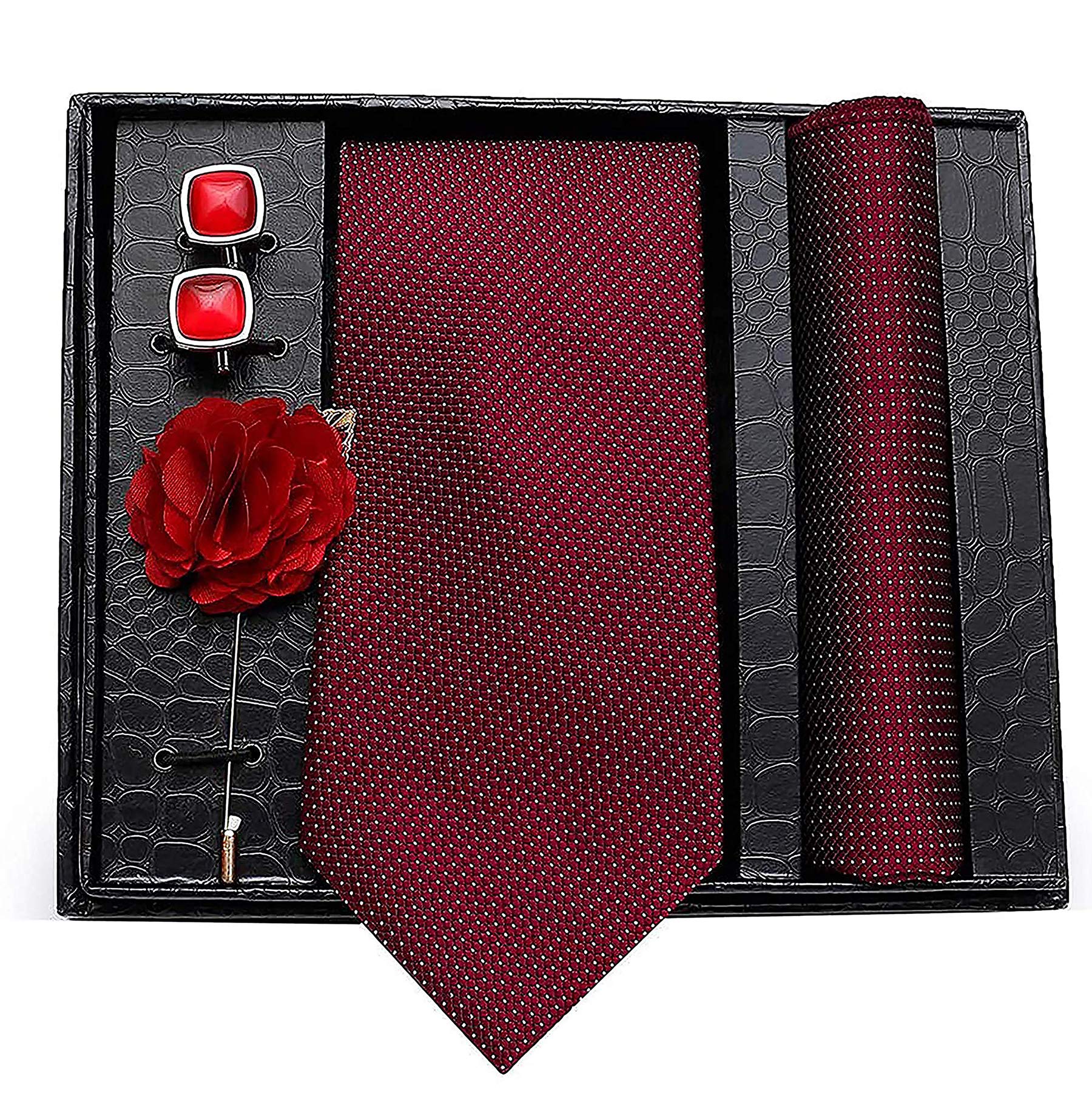 Axlon Men's Micro Polyester Necktie, Pocket Square, Brooch Pin and Cufflinks Combo (Red Maroon, Free Size)
