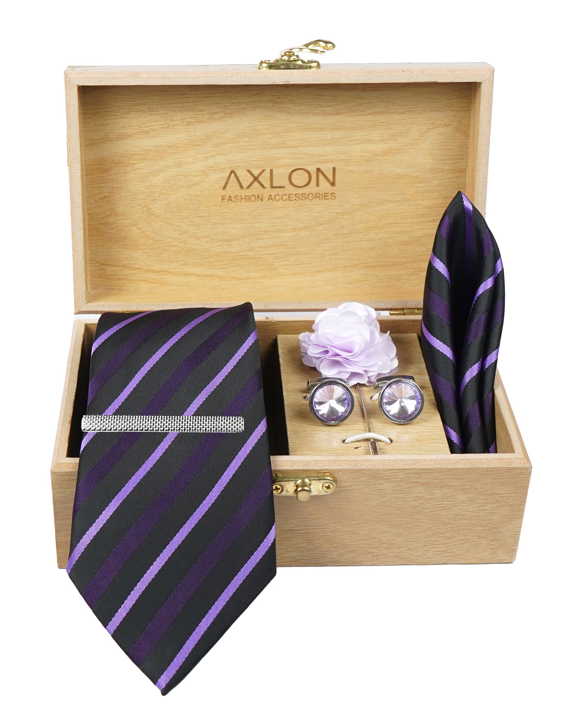 Make a lasting impression with Axlon's premium tie set for men in Royal Purple with a striped finish - a complete necktie gift box designed for elegance and occasion. Each set includes a coordinated necktie, pocket square, stone cufflinks, silver metal tie clip, and a floral lapel pin, carefully arranged in a stylish beige wooden gift box.