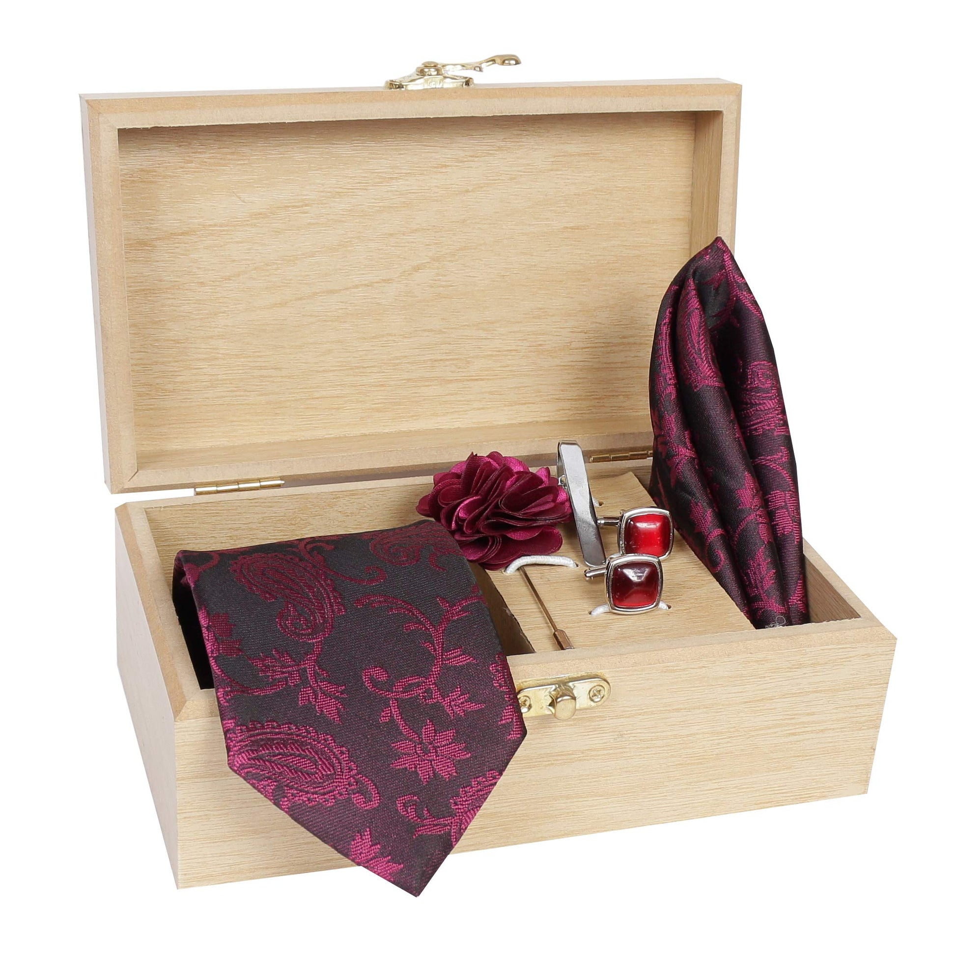 AXLONMen's Micro Polyester Casual Formal Printed Necktie Set with Pocket Square, Brooch Pin and Cufflinks in Wooden Box (Free Size)