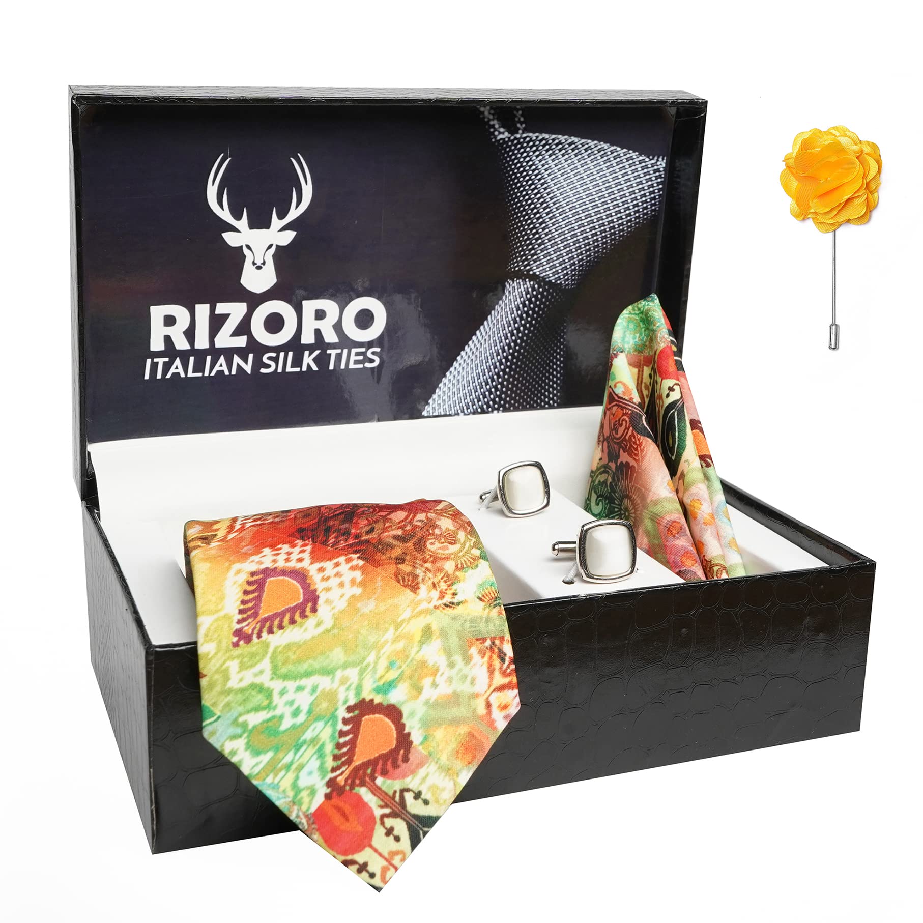 RIZORO Mens Plaid Boho Printed Silk Necktie Gift Set With Pocket Square Cufflinks & Brooch Pin Formal Tie With Leatherite Box (BOHORX Free Size) | (Leather Gift Box) (Pack of 4)