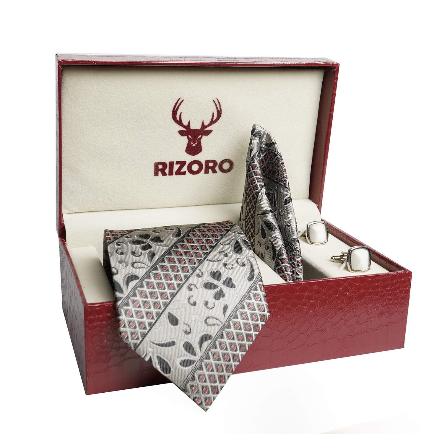 RIZORO Mens Plaid Pasiley Silk Necktie Tie Gift Set With Pocket Square, Cufflinks & Brooch Pin Formal Tie With Leatherite Box (AS1RB, Free Size)