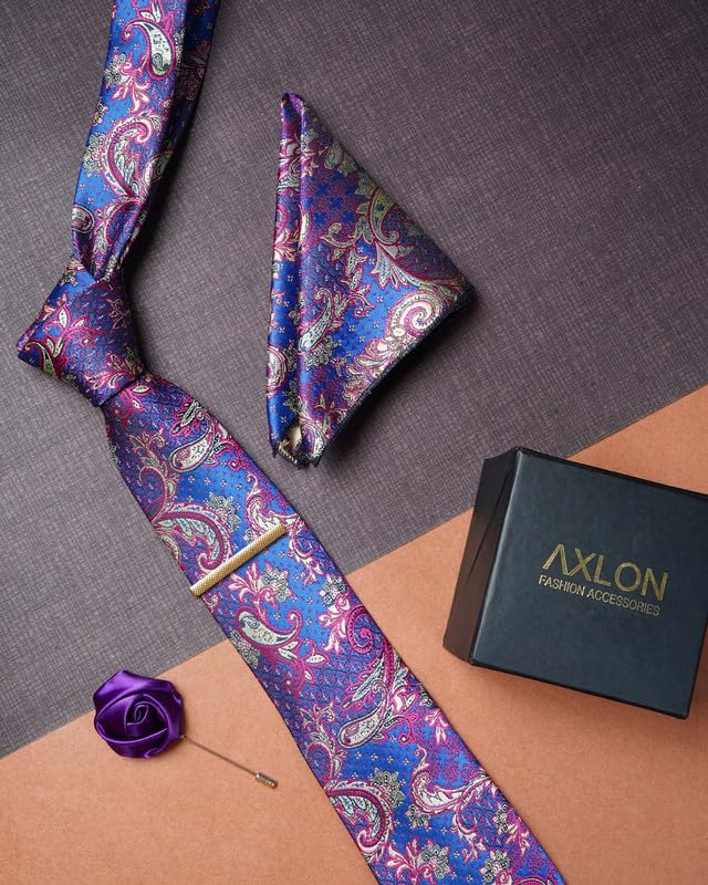 AXLON Pasiley Tie For Men – Formal Ties Set With Pocket Square, Cufflink, Tie Clip & Flower Pin With Gift Box For Mens (AXPL)