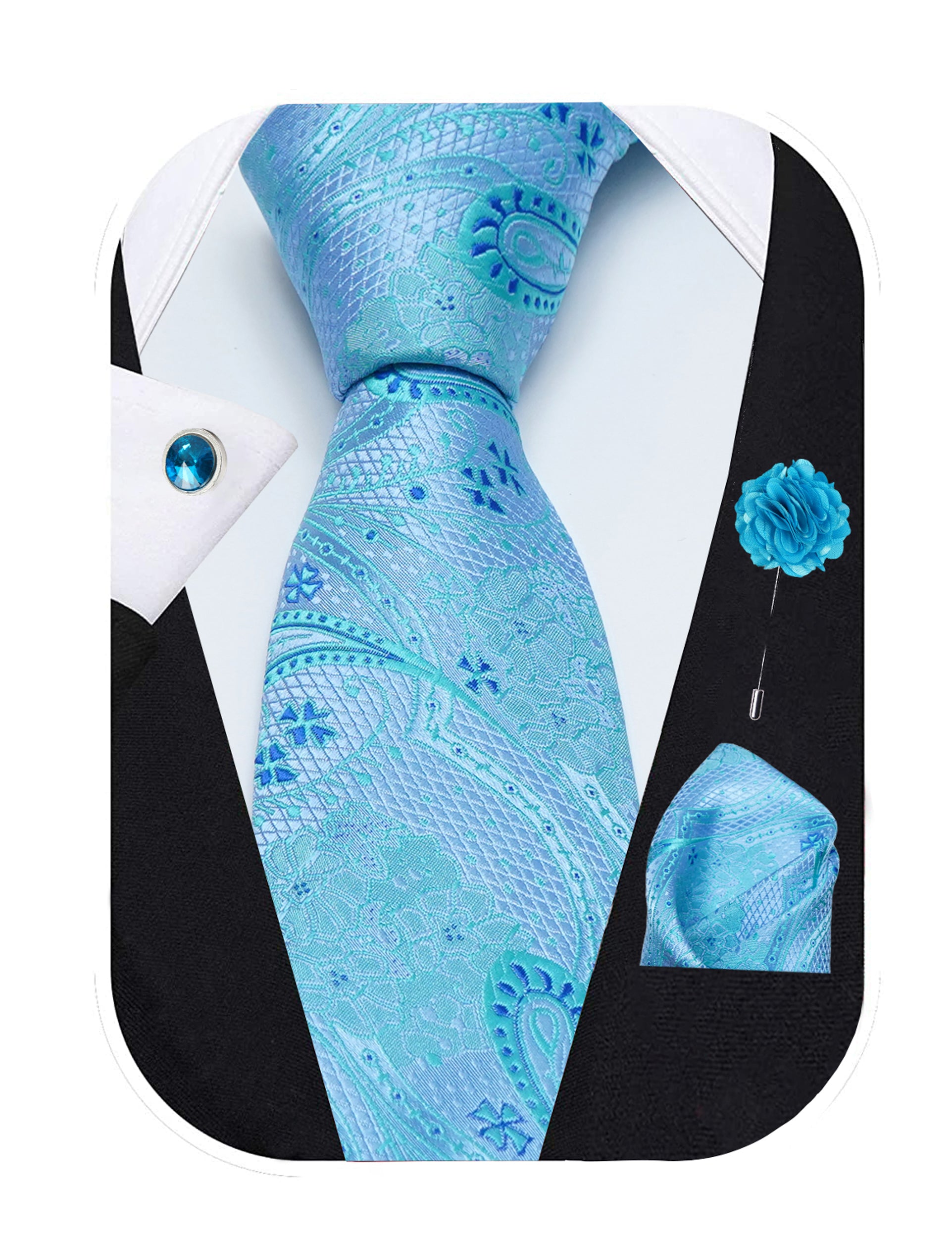 Make a lasting impression with Axlon's premium tie set for men in Skyline Blue with a paisley finish - a complete necktie gift box designed for elegance and occasion. Each set includes a coordinated necktie, pocket square, stone cufflinks, silver metal tie clip, and a floral lapel pin, carefully arranged in a stylish beige wooden gift box.