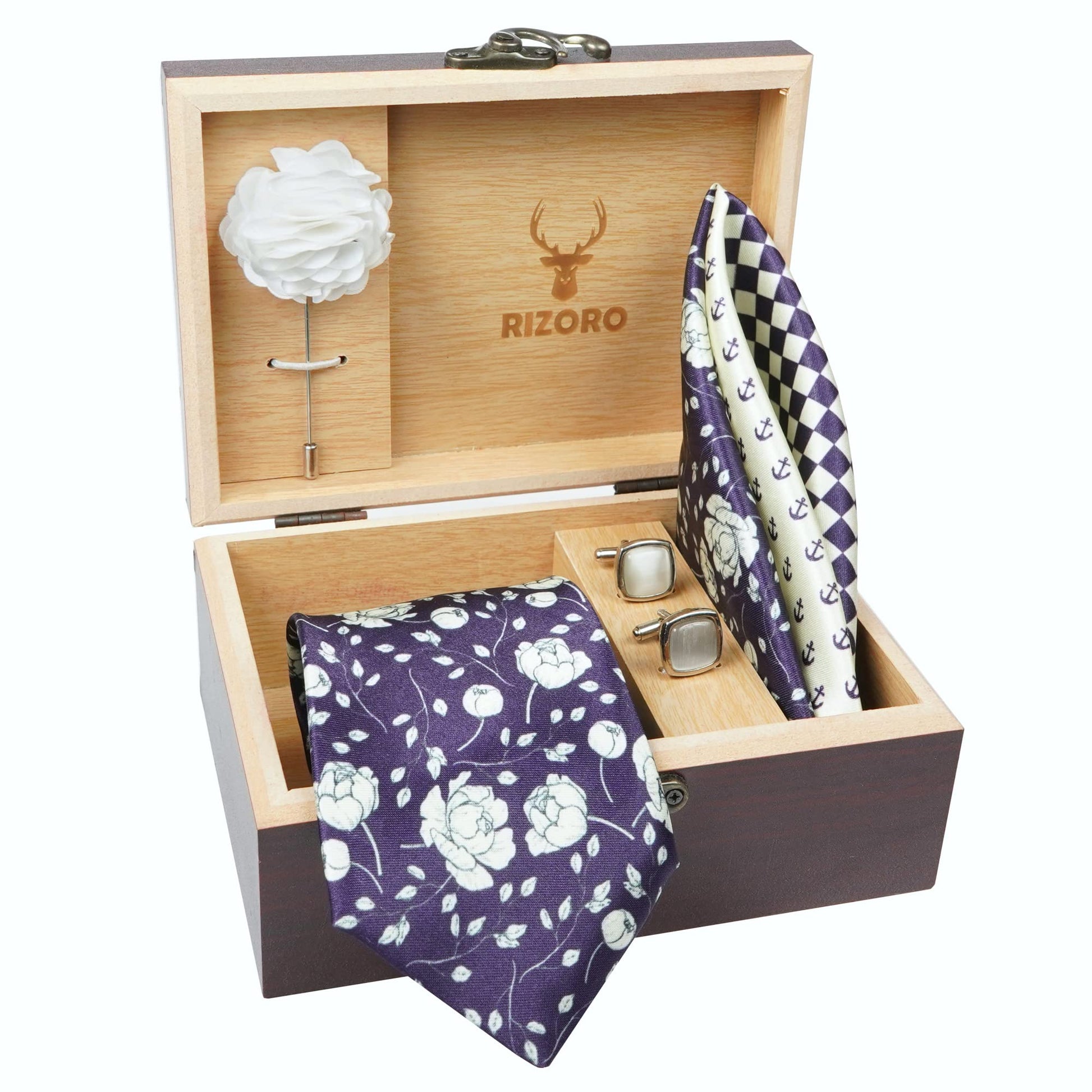 RIZORO Purple Mens Paisley Micro Print Silk Necktie Gift Set With Pocket Square Cufflinks & Brooch Pin Formal Tie With Wooden Box Free Size | (Wooden Gift Box ) (Pack of 4) (RPL_43)