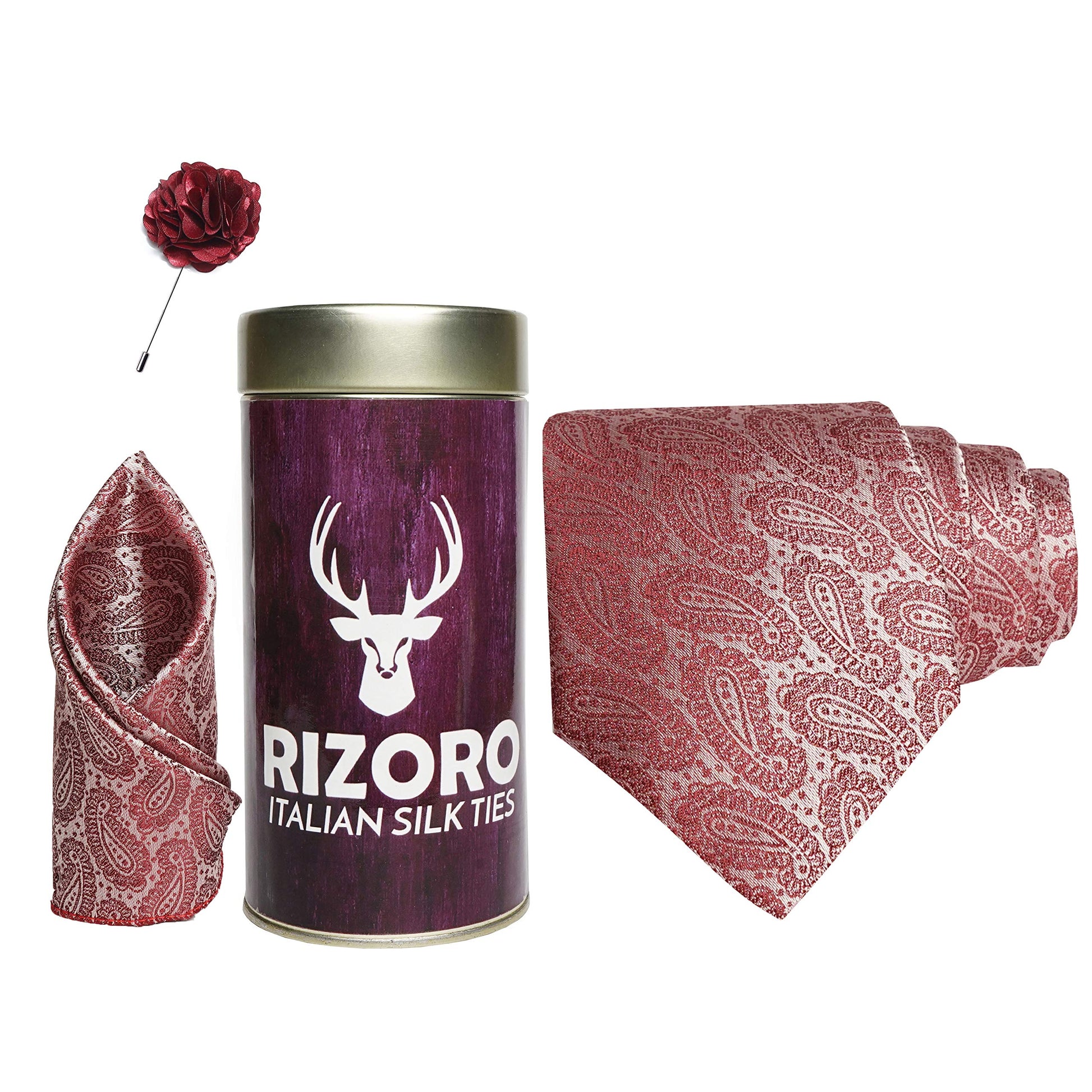 RIZORO Mens Plaid Pasiley Silk Necktie Gift Set With Pocket Square & Brooch Pin Formal Tie Combo (AMBM1RT, Free Size)