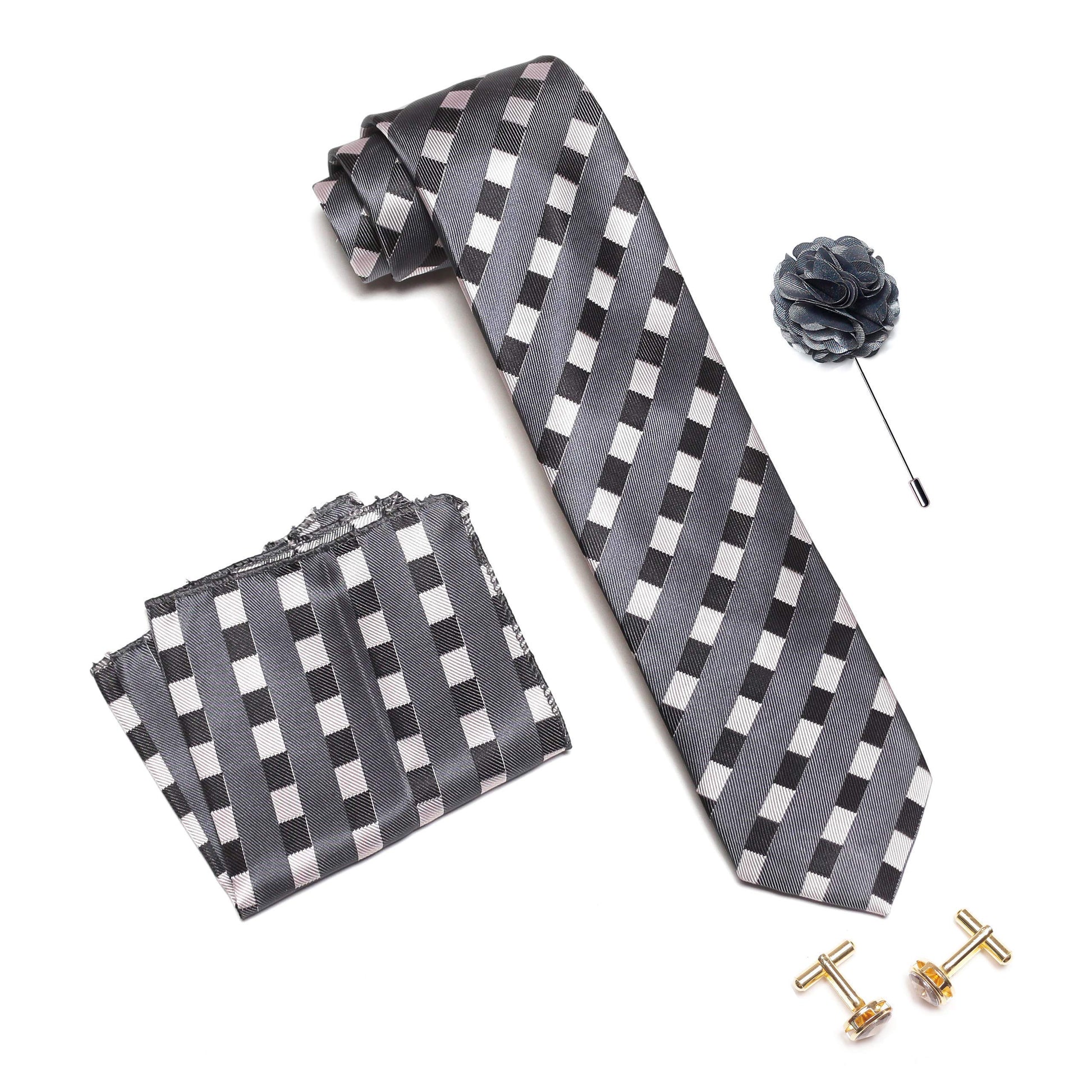 Axlon Men's Micro Polyester Broad-Stripped Necktie Set with Pocket Square, Brooch Pin and Cufflinks (Dark Grey, Free Size)