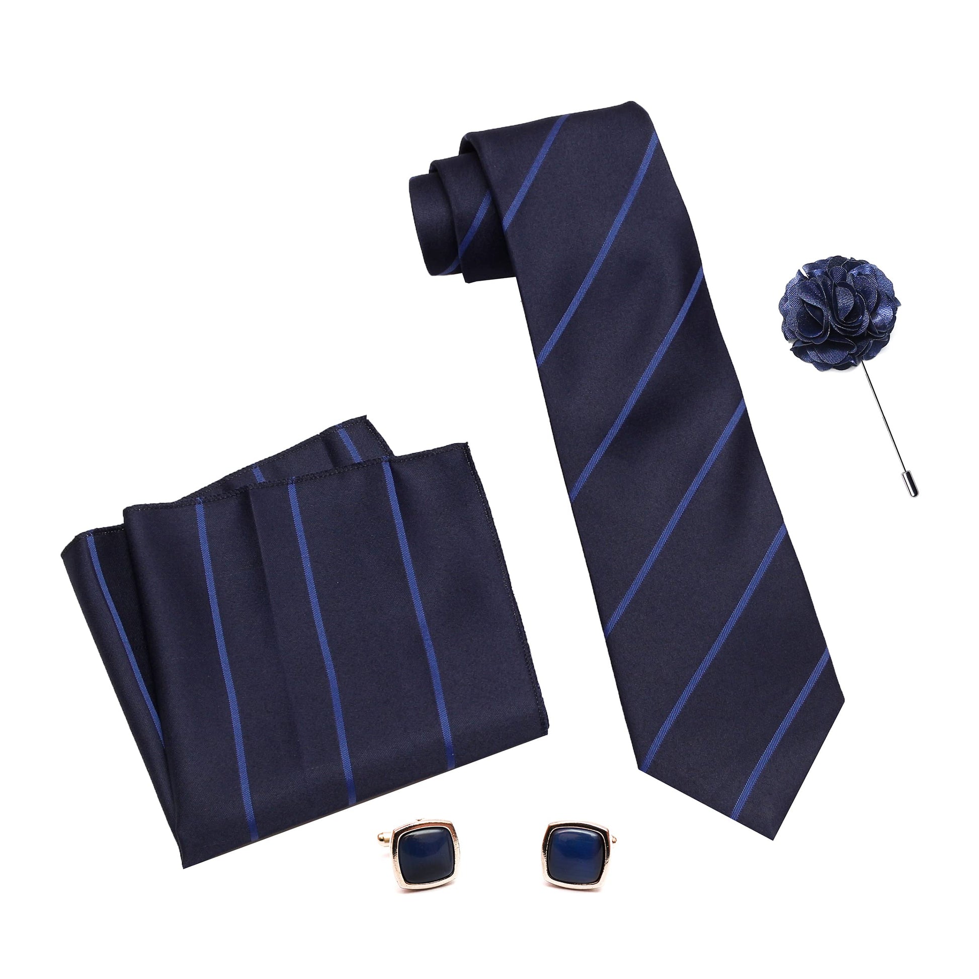 RIZORO Mens Plaid Stripped Silk Necktie Gift Set With Pocket Square Cufflinks & Brooch Pin Formal Tie With Leatherite Box (S2RX Free Size) | (Leather Gift Box) (Pack of 4)