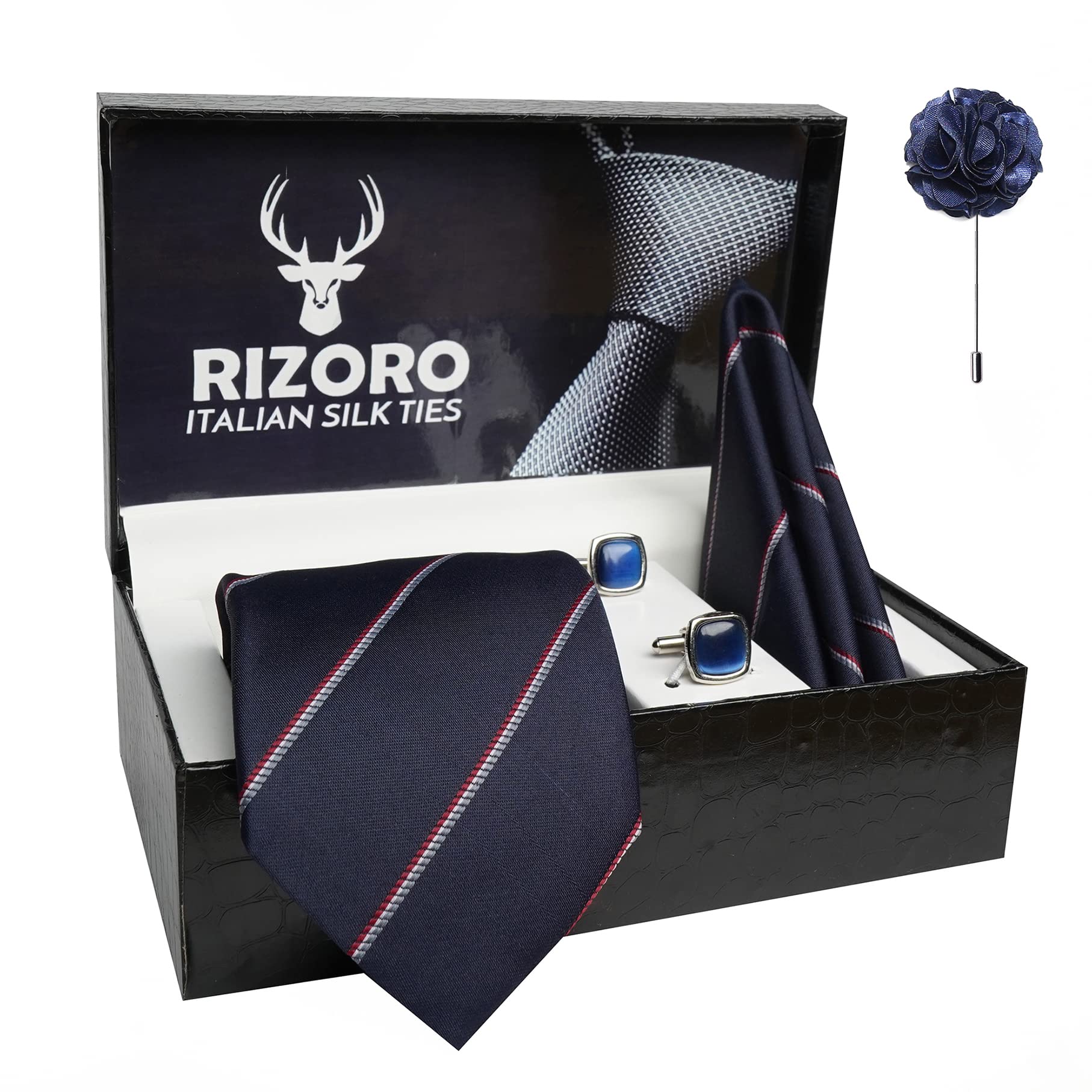 RIZORO Mens Plaid Stripped Silk Necktie Gift Set With Pocket Square Cufflinks & Brooch Pin Formal Tie With Leatherite Box (S4RX Free Size) | (Leather Gift Box) (Pack of 4)