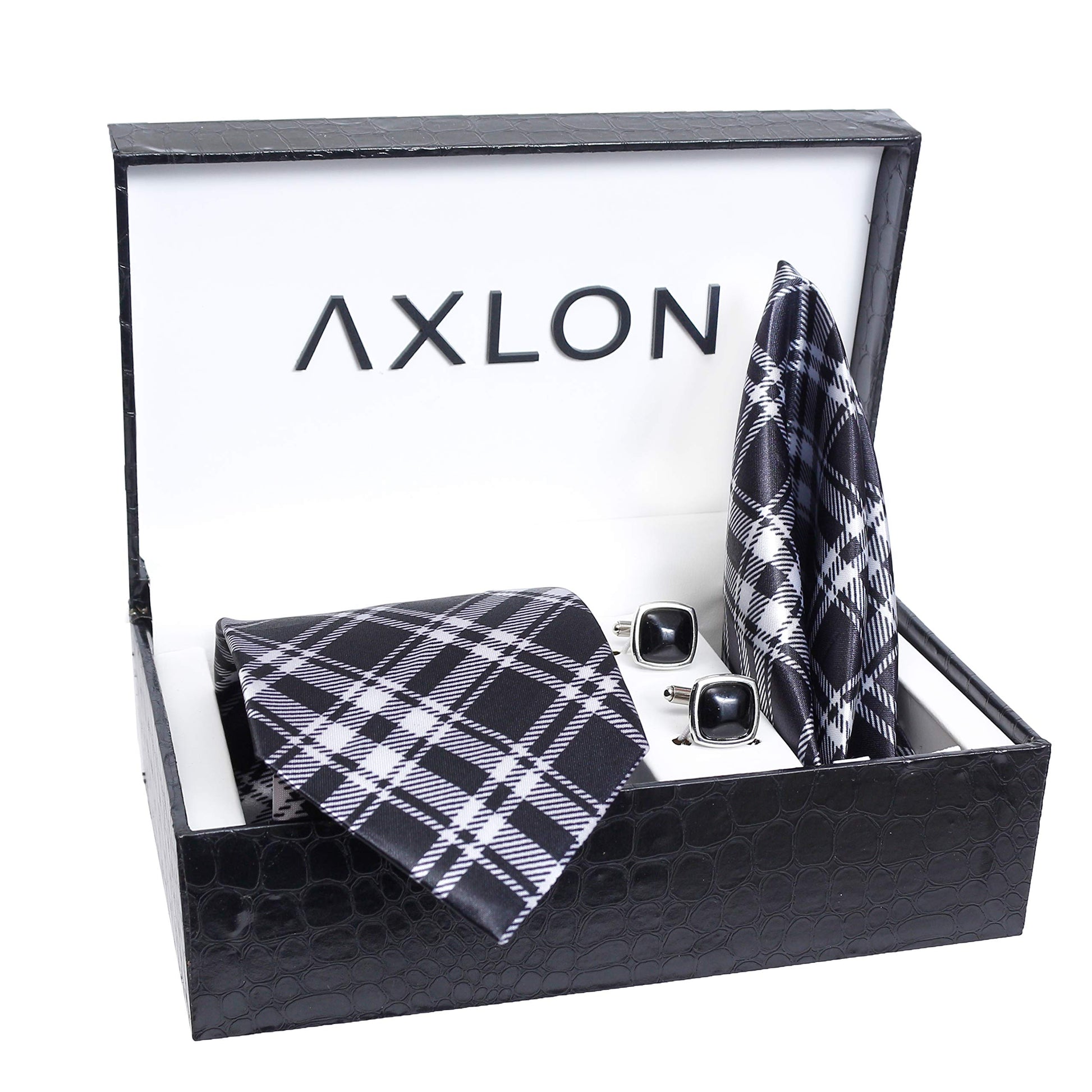 Axlon Men Formal/Casual Printed Satin Neck Tie Pocket Square Accessory Gift Set with Cufflinks and Brooch Pin - Black (Free Size, ltr_826)